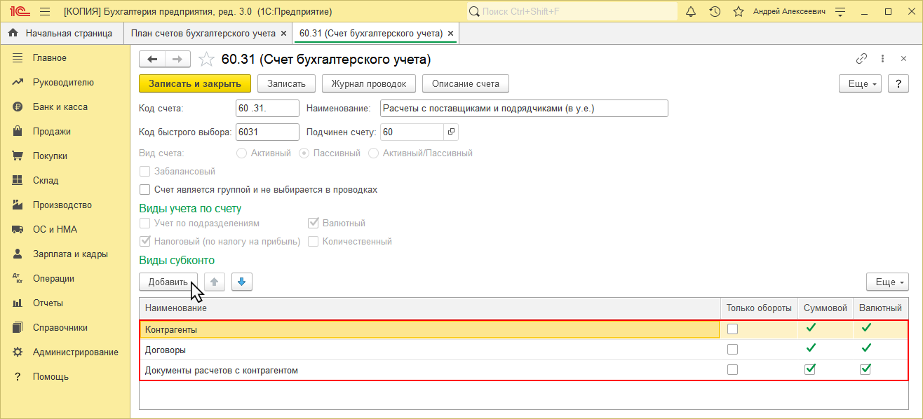 • подключить субконто к счету по кнопке «Добавить» (максимально возможное количество субконто (разрезов аналитики) – три;