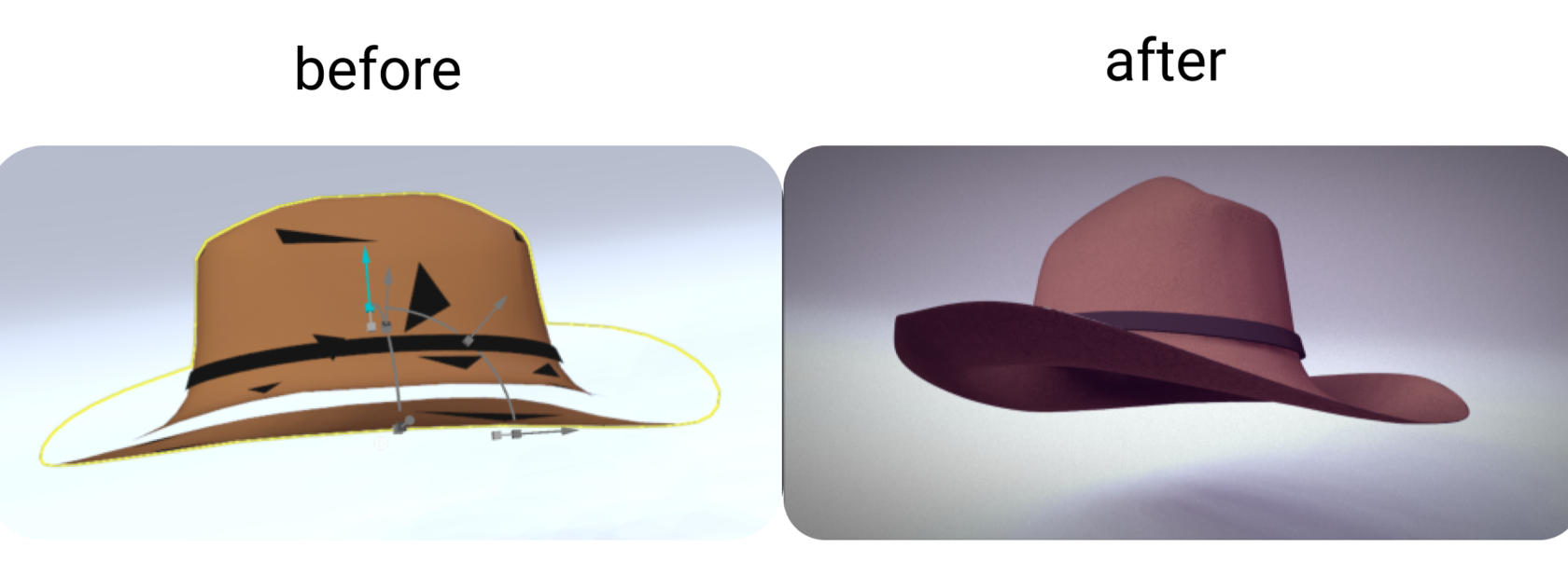 На этом снимке видно, что 3D модель не имеет толщины, видно сквозь ободок шляпы, потому что «двусторонние материалы» отключены. Также артефакты, черные треугольники, мешают рендерингу (отдельные лица). На следующем этапе я свариваю их и делаю на четыре части.